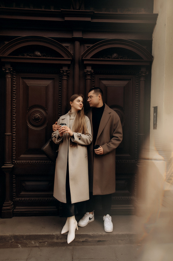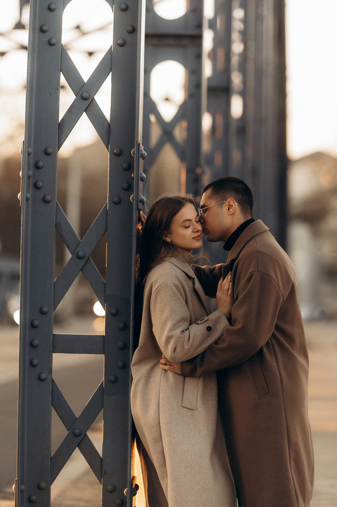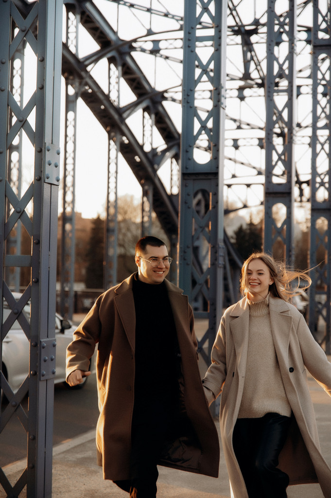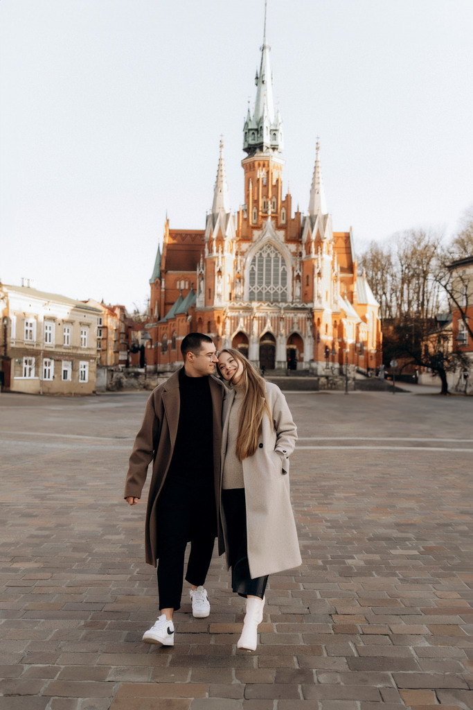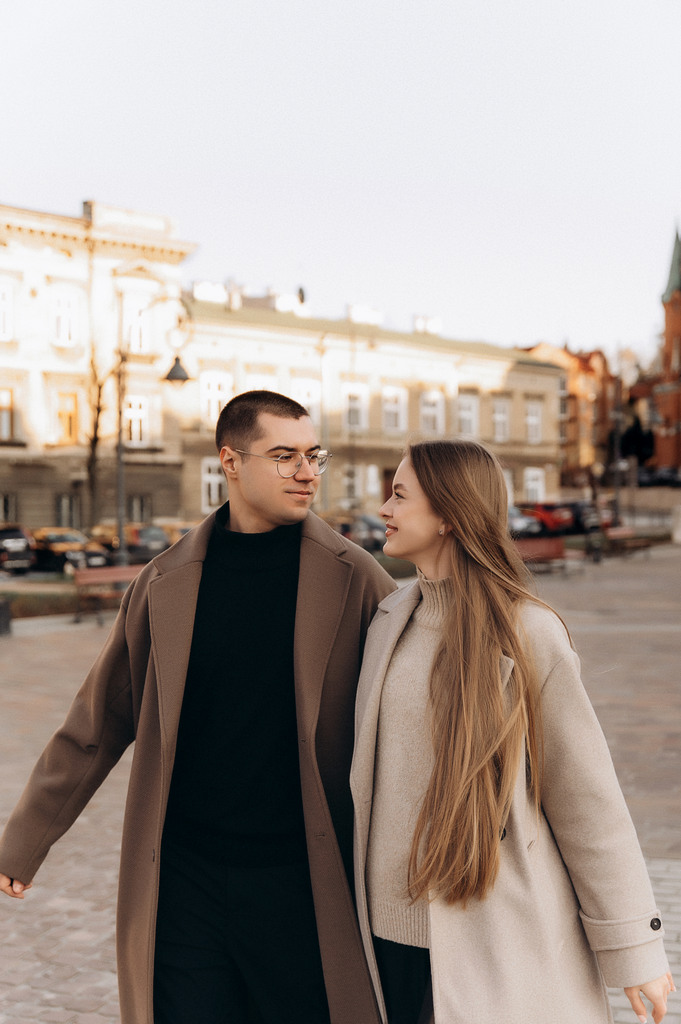 Sesja zdjęciowa pary na Starym Mieście w Krakowie. Chłopak i dziewczyna spacerują wąskimi uliczkami i mostem