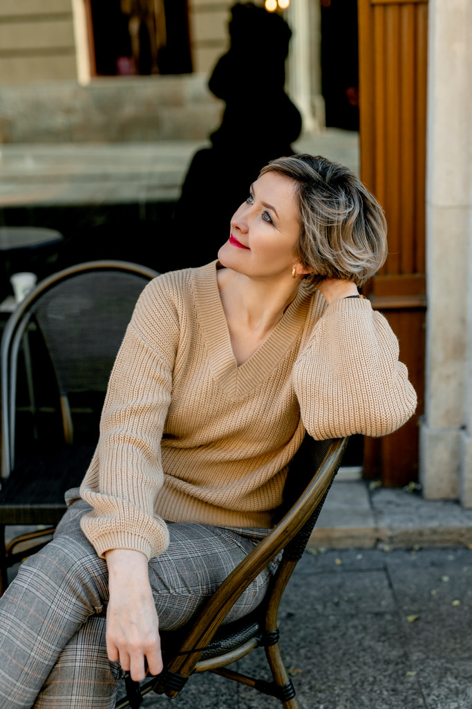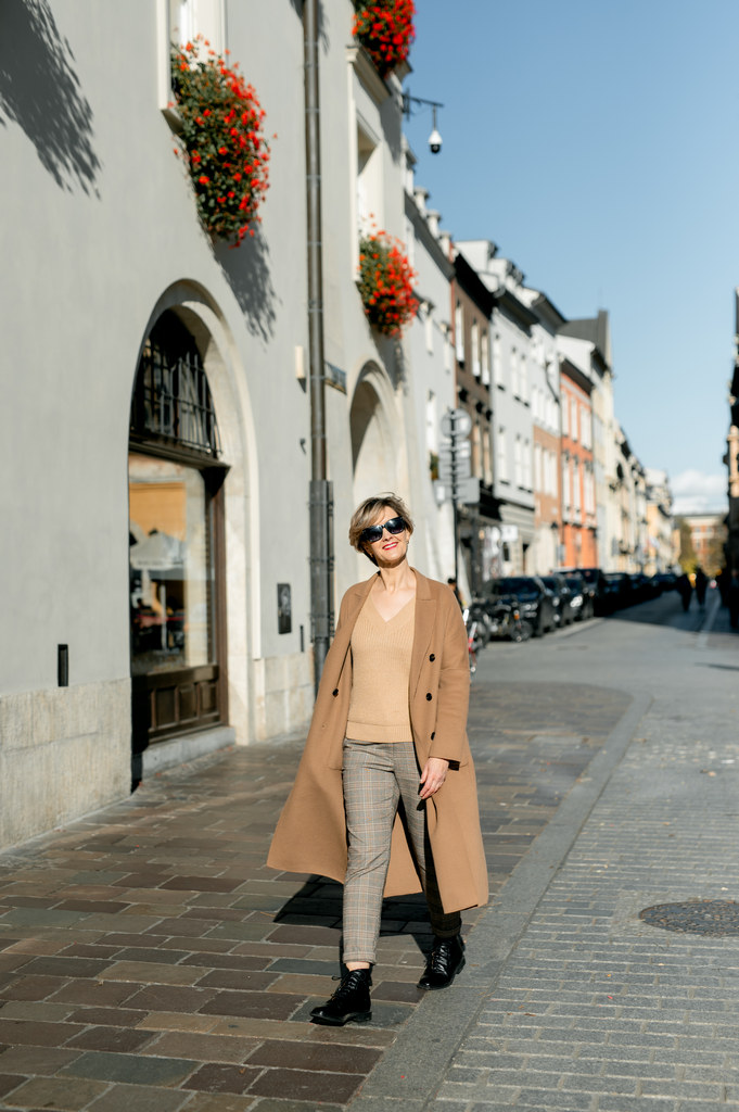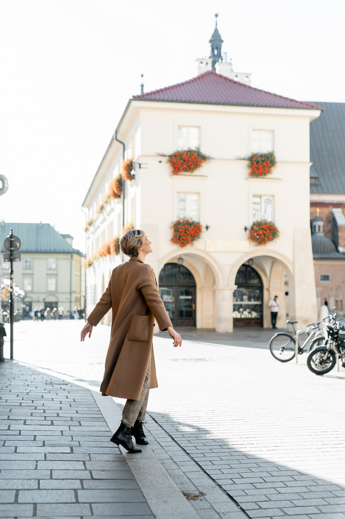 Sesja zdjęciowa dziewczyny na starówce w Krakowie. Dziewczyna spaceruje po ulicach starówki wiosną