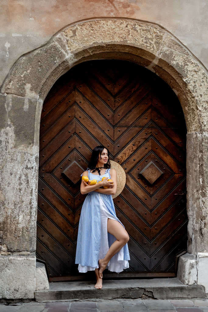 Sesja zdjęciowa dziewczyny w Krakowie. W lekkiej sukience i z siatką cytryn.