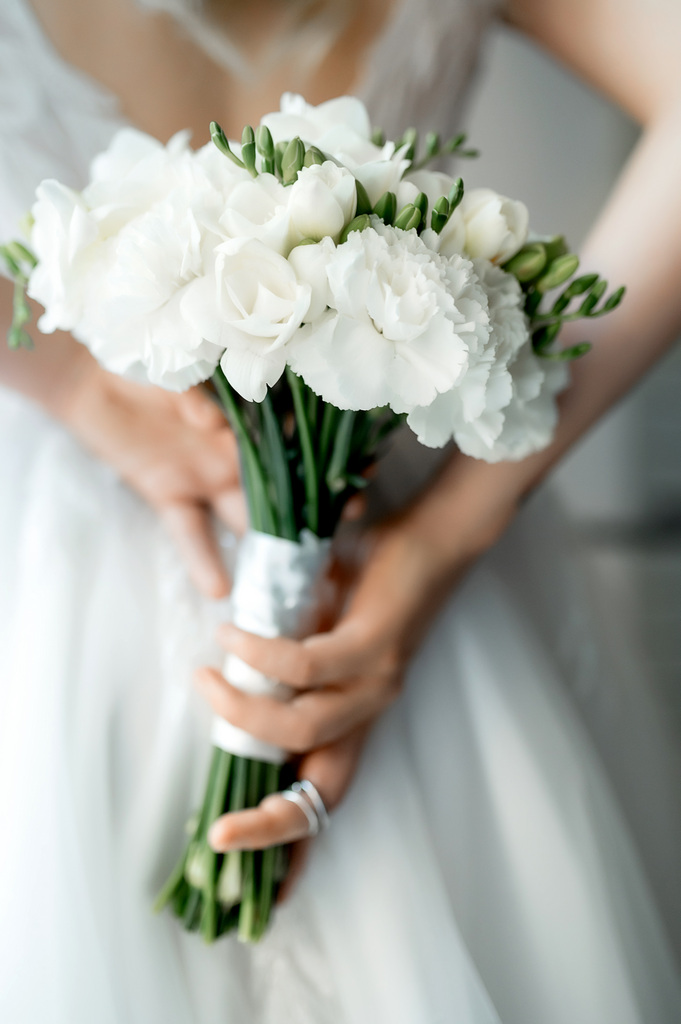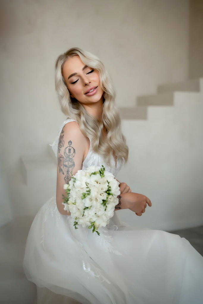 Sesja zdjęciowa Panny Młodej w mieście Krakowie. Bukiet ślubny w rękach Panny Młodej